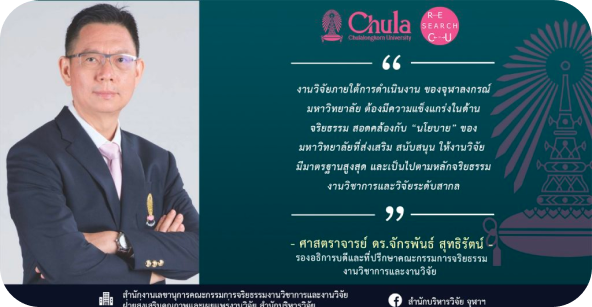 จุฬาลงกรณ์มหาวิทยาลัย มีนโยบายมาตรฐานด้านจริยธรรมในด้านงานวิชาการและงานวิจัย เพื่อสร้างความเชื่อมั่นตามมาตรฐานในระดับสากล เรามีระบบการจัดการเพื่อสนับสนุนกิจกรรมด้านจริยธรรมงานวิชาการและงานวิจัย มุ่งให้ความรู้ เสริมสร้างจิตสำนึก สร้างความตระหนักรู้ ให้แก่บุคลากรและนิสิต เรามีกระบวนการรับข้อร้องเรียน ที่มีความโปร่งใสและยุติธรรม มหาวิทยาลัยจึงได้มีการจัดตั้งคณะกรรมการจริยธรรม งานวิชาการและงานวิจัยขึ้นเพื่อเสริมสร้างความรู้ทางด้านจริยธรรมให้กับคณาจารย์นักวิจัยของมหาวิทยาลัย
